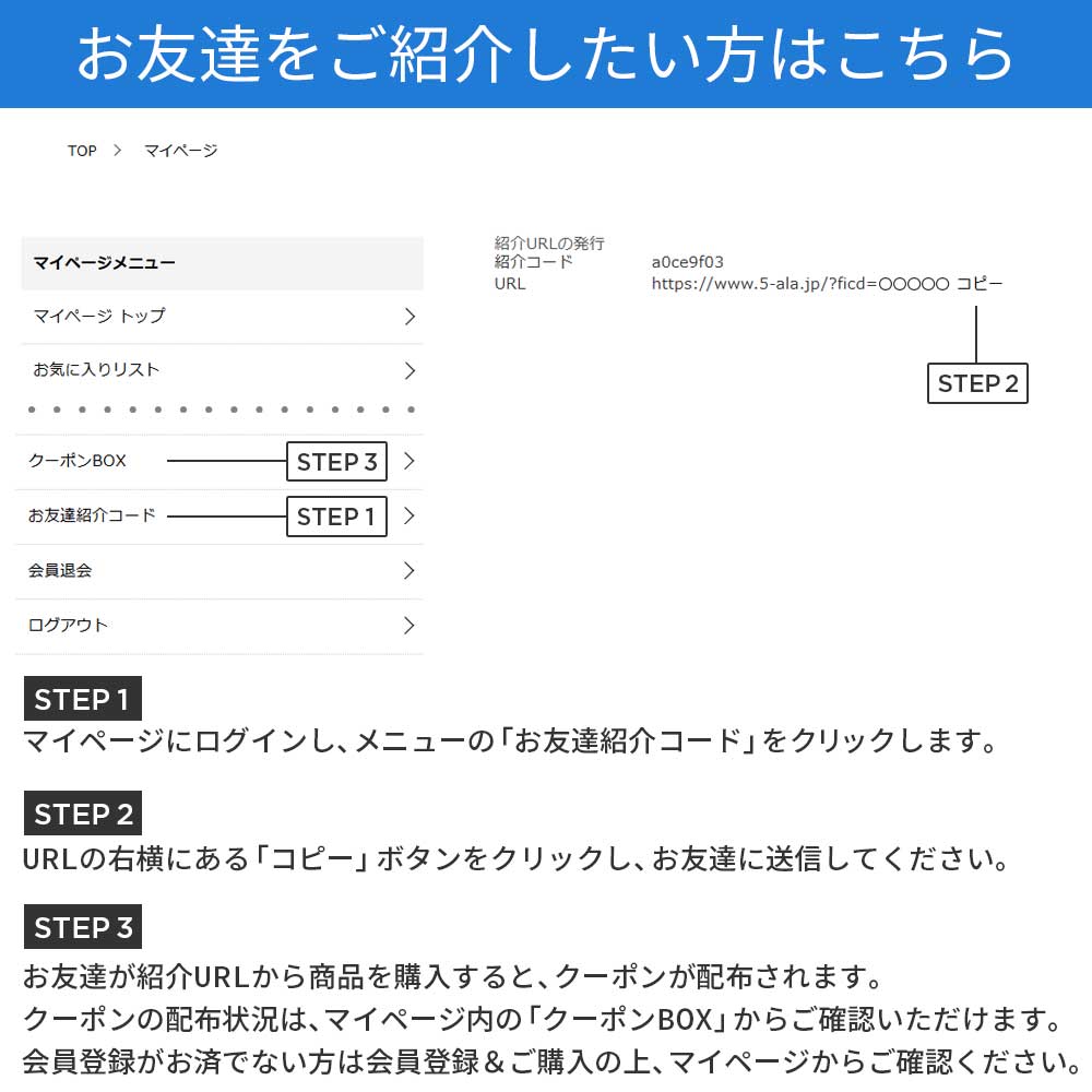 紹介する方はアラオンラインにログイン後、マイページのメニューから「お友達紹介コード」の欄を選択、記載されている「紹介URL」をメールやチャット等で家族や友達にご紹介ください。