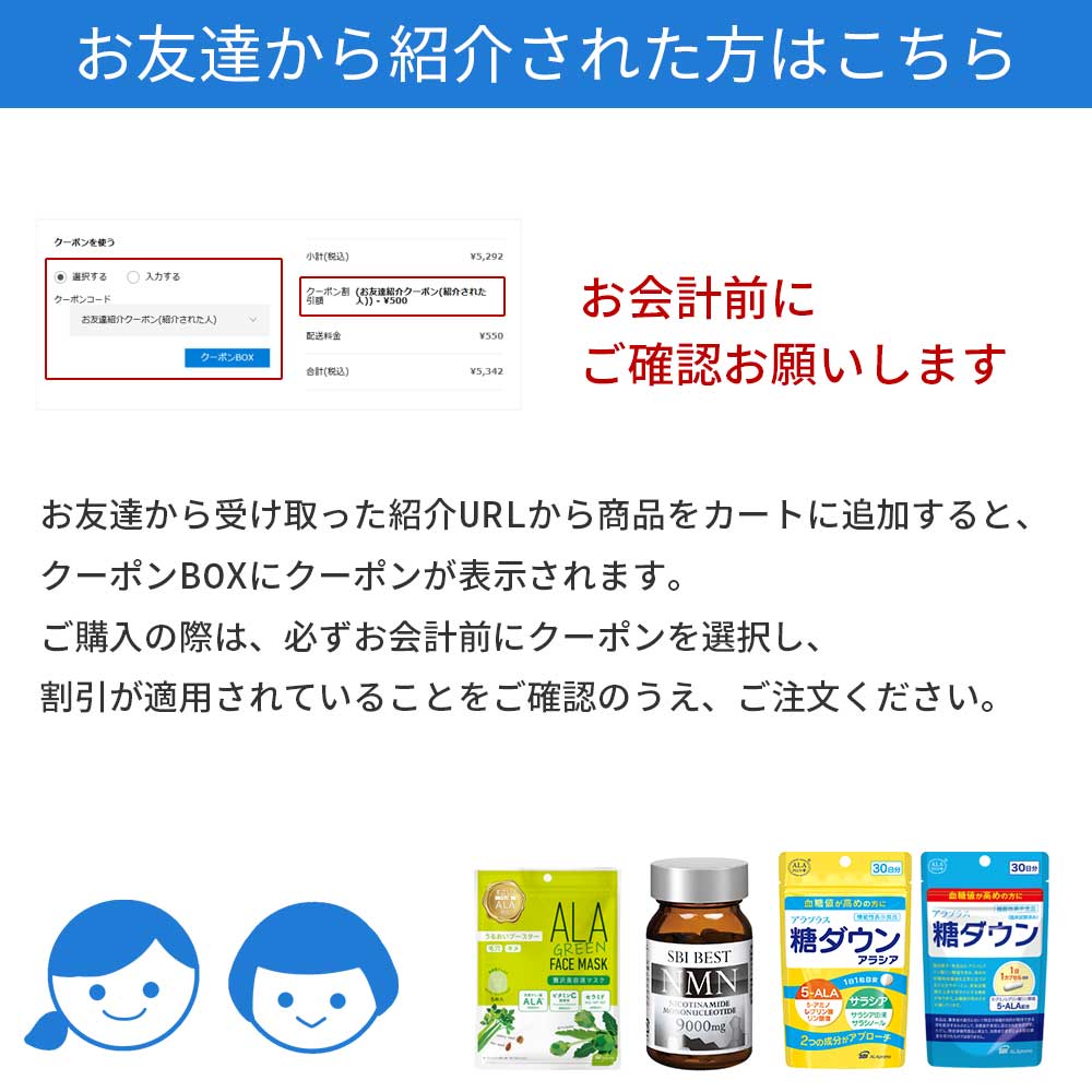 SBIホールディングス株式会社の子会社で5-アミノレブリン酸リン酸塩(以下「5-ALA(※1)」)を利用した健康食品、化粧品の製造・販売等を行っているSBIアラプロモ株式会社(本社:東京都港区、代表取締役:竹崎 泰史、以下「SBIアラプロモ」)は、2025年10月31日(金)まで、「お友達紹介キャンペーン」を開催いたします。公式ECサイトのアラオンライン(https://www.5-ala.jp/)会員のお客さまが一定期間中に紹介URLを介して家族や友人を紹介すると紹介された方に、また紹介された方がアラオンラインで購入を完了すると紹介した方に、それぞれアラオンラインで使用できる500円OFFクーポンをプレゼントいたします。