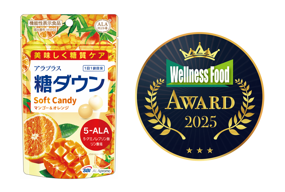 この度、SBIホールディングス株式会社の子会社で5-アミノレブリン酸リン酸塩(以下5-ALA(※1))を利用した健康食品、化粧品の製造・販売等を行っているSBIアラプロモ株式会社(本社:東京都港区、代表取締役:竹崎 泰史、以下「SBIアラプロモ」)は、第8回ウェルネスフードアワード2025のOYATSU部門にて、糖質ケアする菓子タイプの機能性表示食品「アラプラス 糖ダウン ソフトキャンディー」が銅賞を受賞しましたことをお知らせいたします。